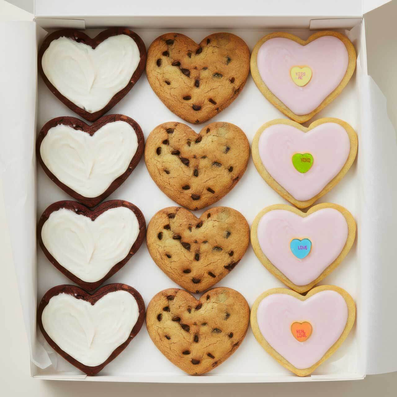 This sweet little box is packed with 12 mini heart-shaped cookies in three crave-worthy flavors: classic chocolate chip, buttery sugar cookie, and rich red velvet. Soft, chewy, and perfectly loveable, they’re baked for sharing with all your favorite people.